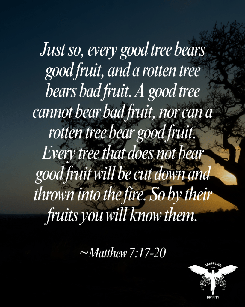 “Just so, every good tree bears good fruit, and a rotten tree bears bad fruit. A good tree cannot bear bad fruit, nor can a rotten tree bear good fruit. Every tree that does not bear good fruit will be cut down and thrown into the fire. So by their fruits you will know them.”