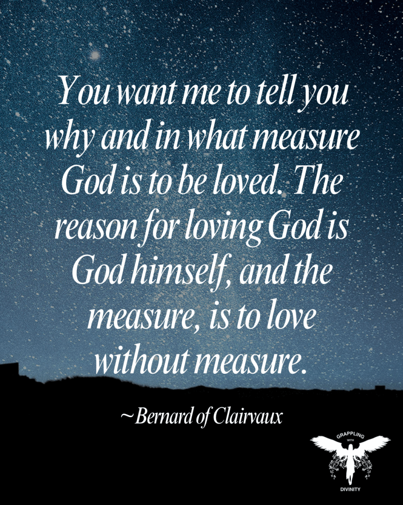 “You want me to tell you why and in what measure God is to be loved. The reason for loving God is God himself, and the measure, is to love without measure.”