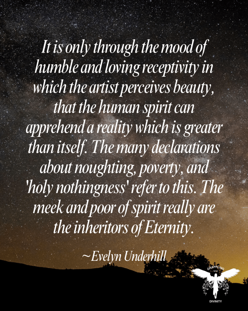 “It is only through the mood of humble and loving receptivity in which the artist perceives beauty, that the human spirit can apprehend a reality which is greater than itself. The many declarations about noughting, poverty, and ‘holy nothingness’ refer to this. The meek and poor of spirit really are the inheritors of Eternity.”
