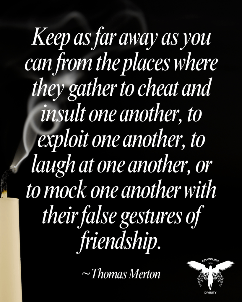 “Keep as far away as you can from the places where they gather to cheat and insult one another, to exploit one another, to laugh at one another, or to mock one another with their false gestures of friendship.”
